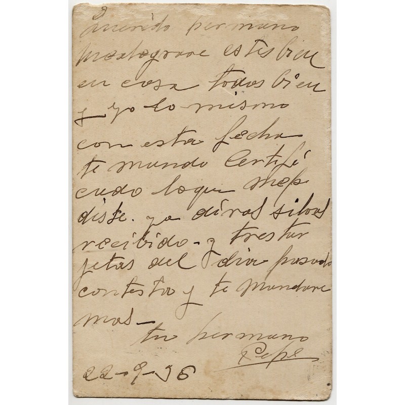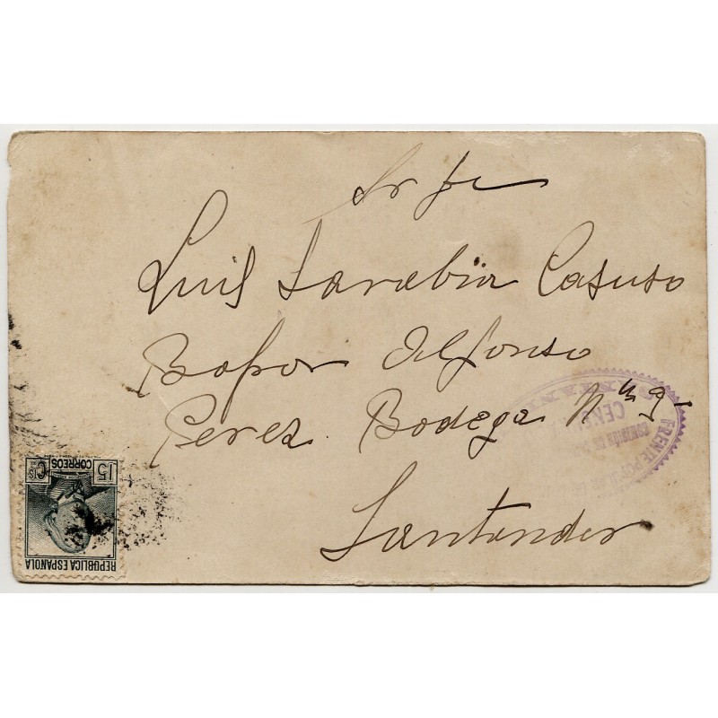 Post card to prison steamship Alfonso Pérez, to the prisoner Luis Sarabia Casuso, in Hold nr. 3.Unreadable postmark, but text on the back dated on September 22, 1936. Santander censor mark Heller RS9.1.