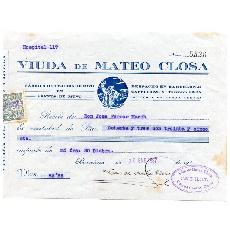 Receipt with mark "Vda. de Mateu Closa / CNT UGT / Comité Control Obrer", 1937
