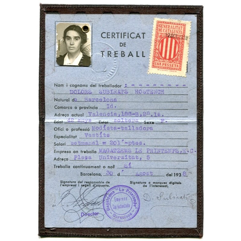 Work certificate of Magatzems Le Printemps Empresa Colectivizada, Barcelona 1938