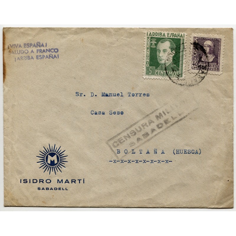 Cover from Sabadell to Boltaña with censor and Falange label, 1939