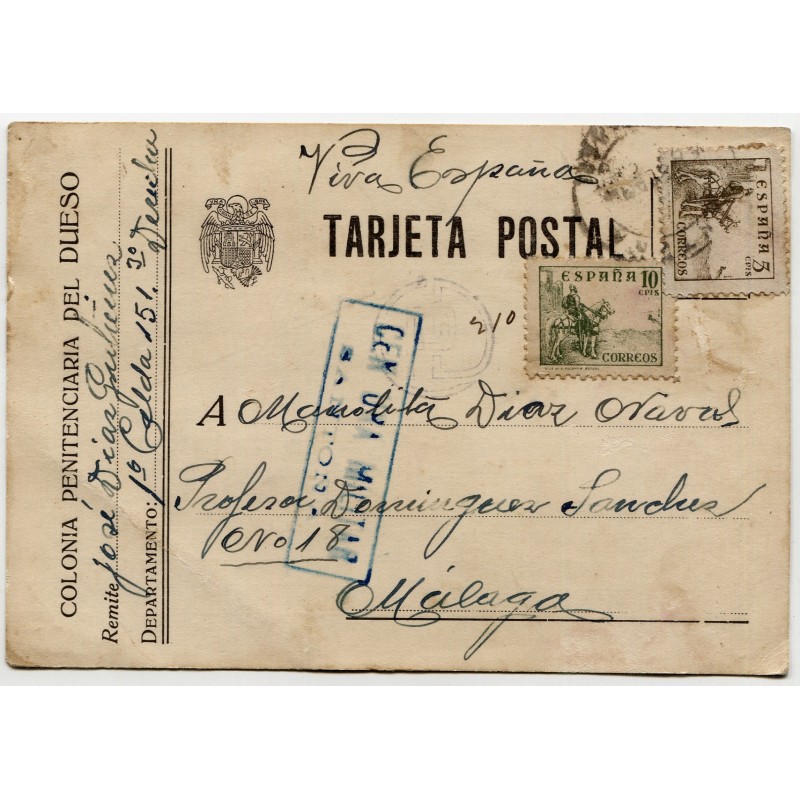 Colonia Penitenciaria del Dueso printed post card to Málaga, 1938