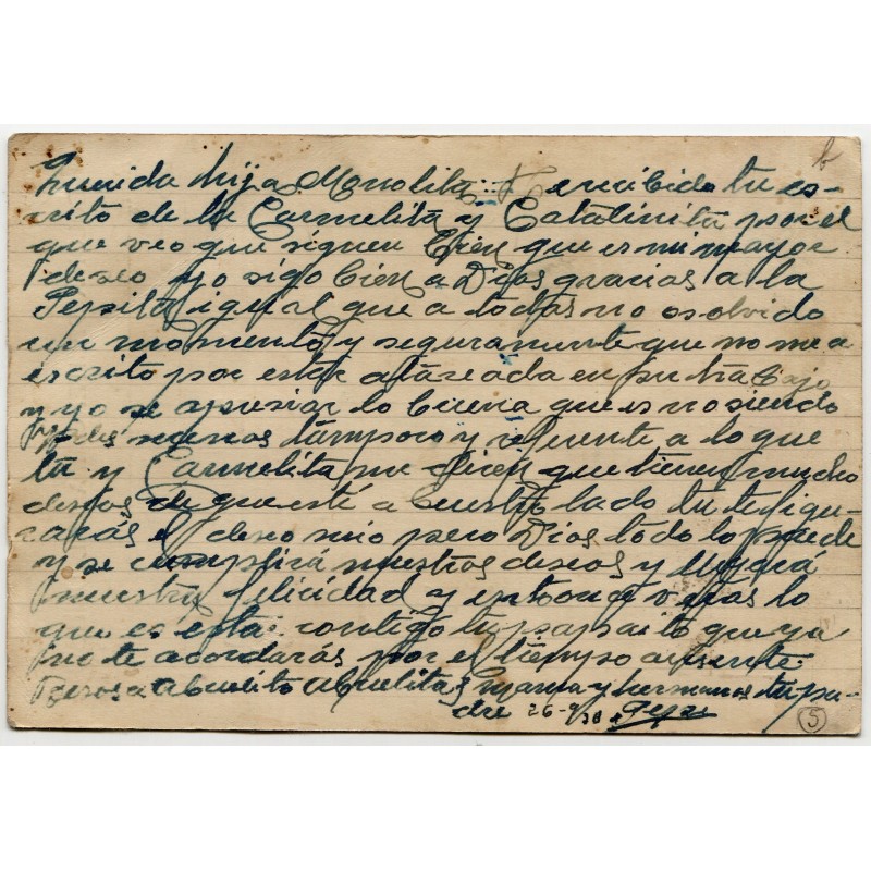 Colonia Penitenciaria del Dueso printed post card, sent by the prisoner José Díaz Gutiérrez, 1º, Celda 151, 3º Derecha. Dueso prison censor mark "CPD" and Santoña censor Heller S73.4. Santoña postmark with unreadable date, but text on the back of October 26, 1938.