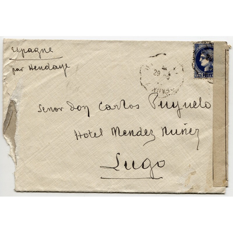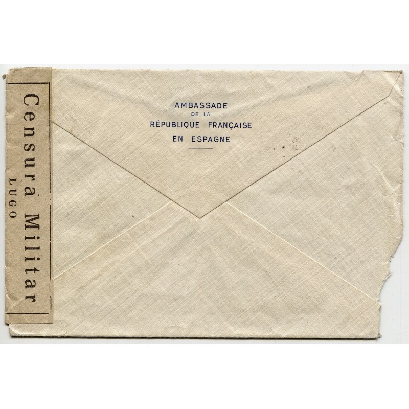 Unreadable postmark, Lugo censor tape Heller L37.7 and letterhead of the French embassy in Spain on the back.