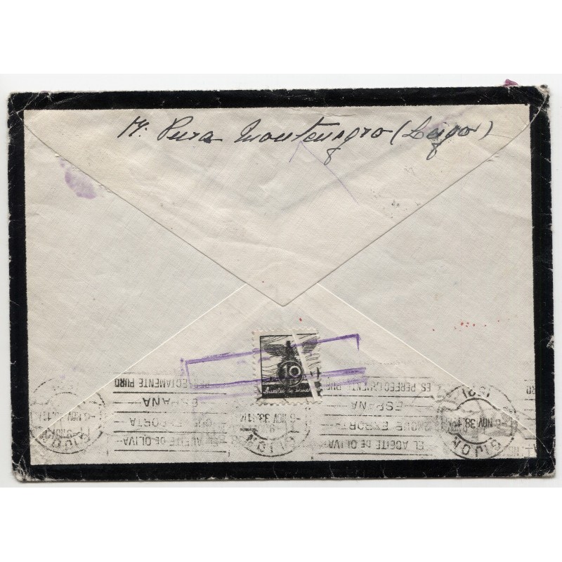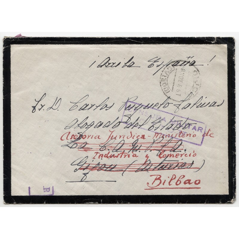 Cover to Gijón redirected to Bilbao with censor, 1938