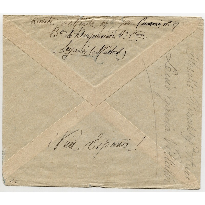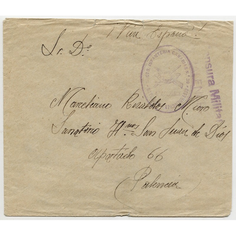 Franchise mark "RGTO. INFANTERÍA CANARIAS Nº 39 / BATALLÓN EXPEDICIONARIO / 1ª COMPAÑÍA" and Palencia censor mark Heller P7.2c. No postmarks.
