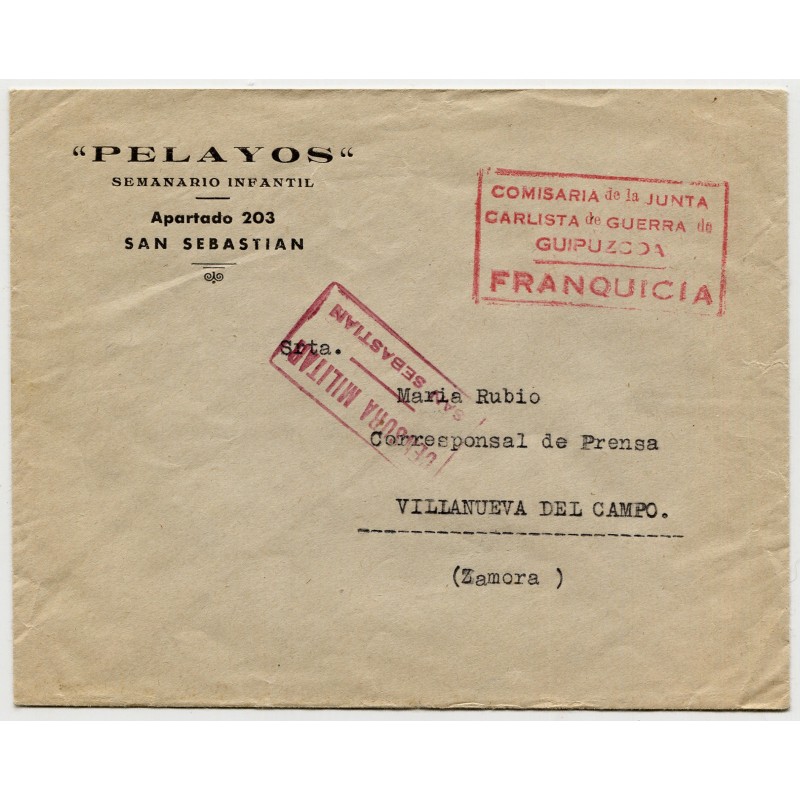 Cover with letterhead "Pelayos / Semanario Infantil" with franchise mark "COMISARIA de la JUNTA CARLISTA de GUERRA de GUIPUZCOA / FRANQUICIA" and San Sebastián censor mark Heller S49.6