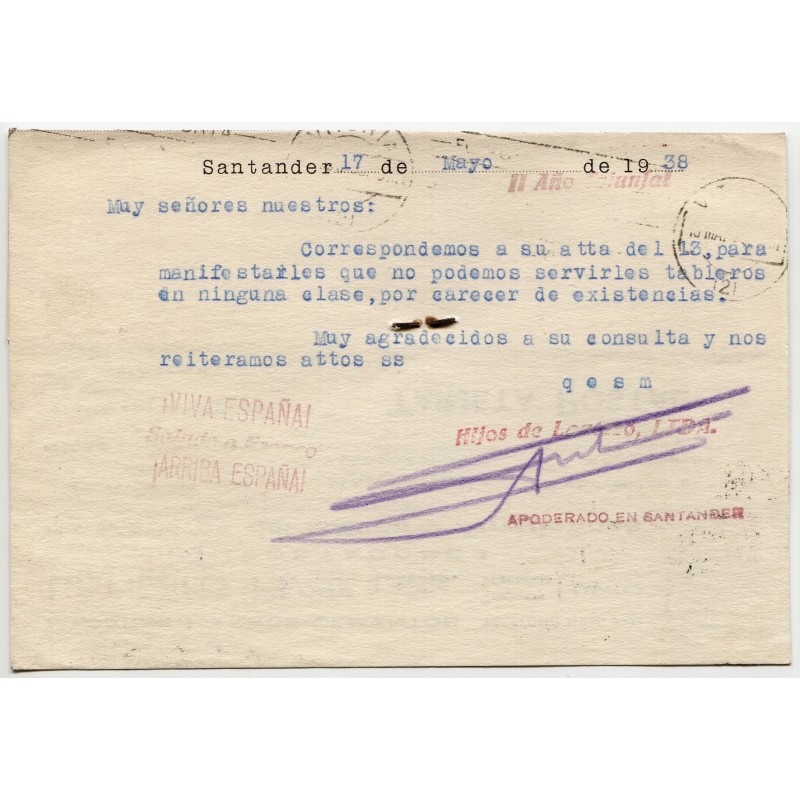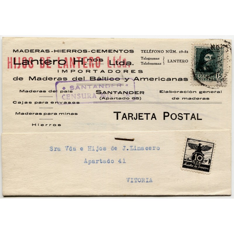 Post card from Santander to Vitoria with censor, 1938