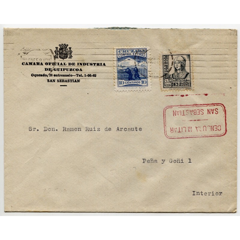 San Sebastián postmark dated on January 8, 1938, Cruzada contra el Frío label and censor mark Heller S49.16.