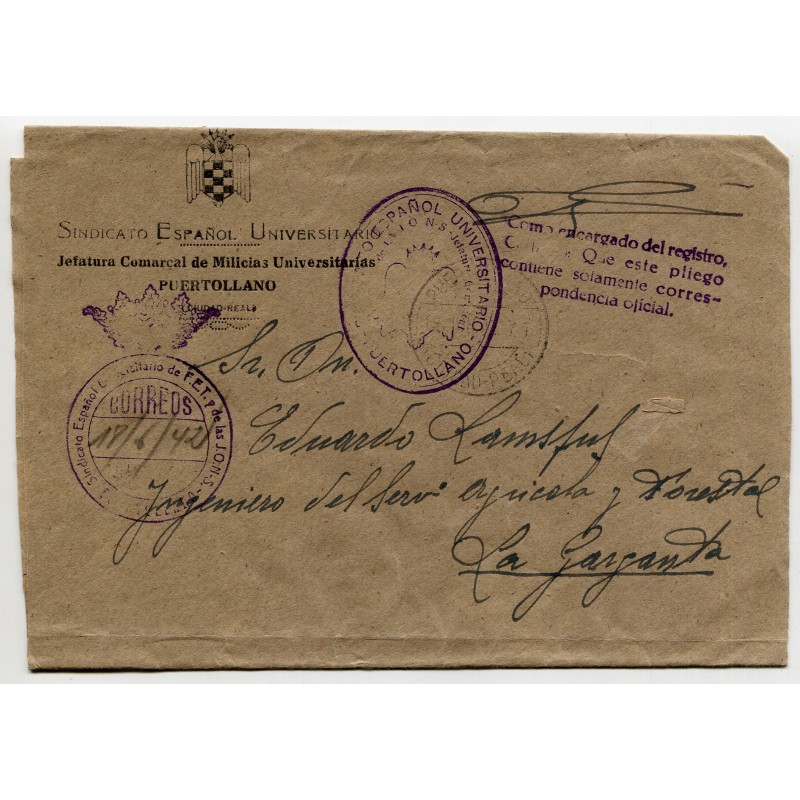 Sindicato Español Universitario from Puertollano franchise on cover to La Garganta, 1942