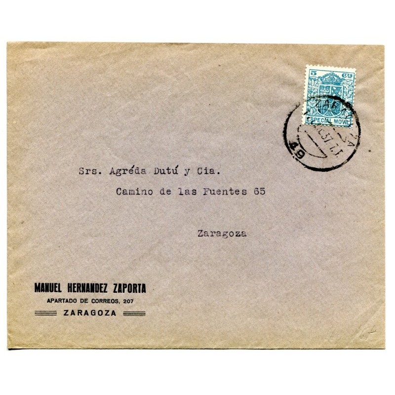 Zaragoza interior mail cover franked with a fiscal, 1937