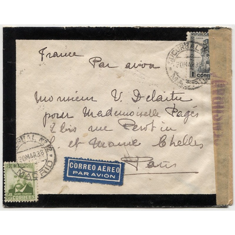 Air mail censored cover from Madrid to Chelles, France, 1938