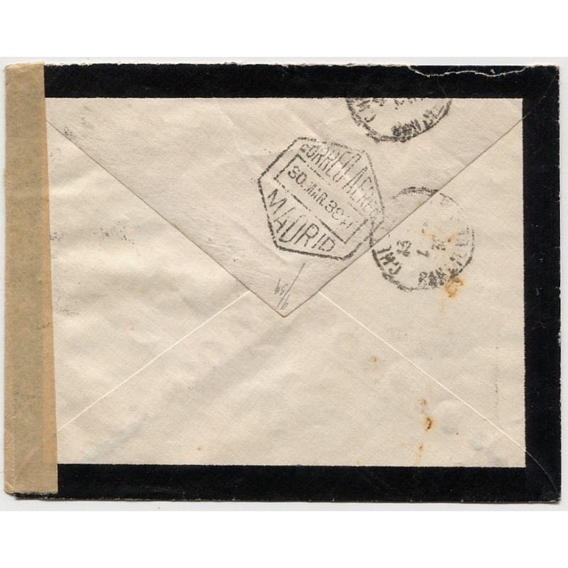 Madrid postmark of March 30, 1938 and censor mark Heller RM1.1. Arrival and transit backstamps.