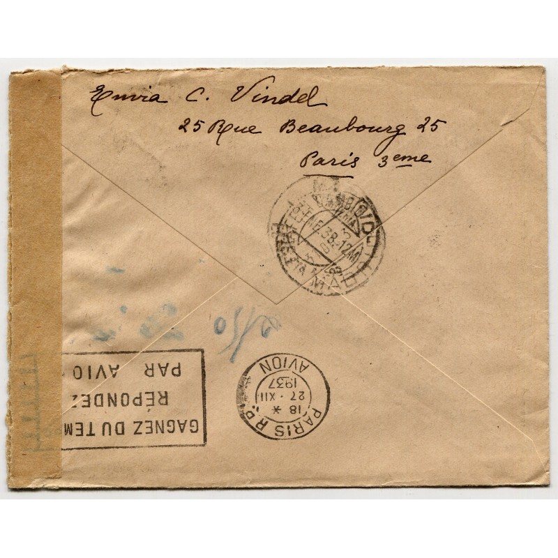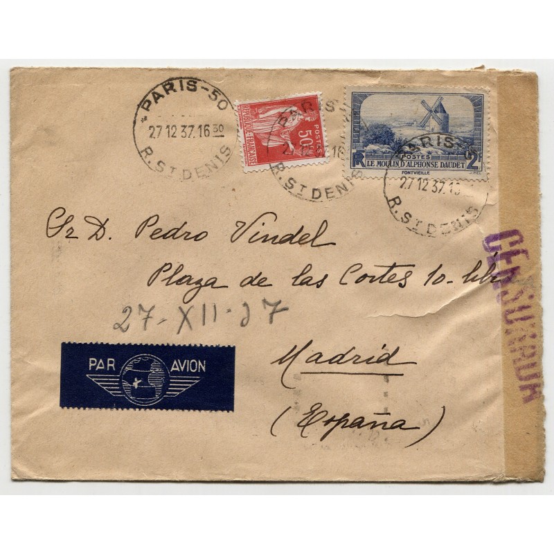 Paris Rue St. Denis postmark dated on Dec. 12, 1937 and Madrid censor mark Heller RM1.1. Transit and arrival backstamps.