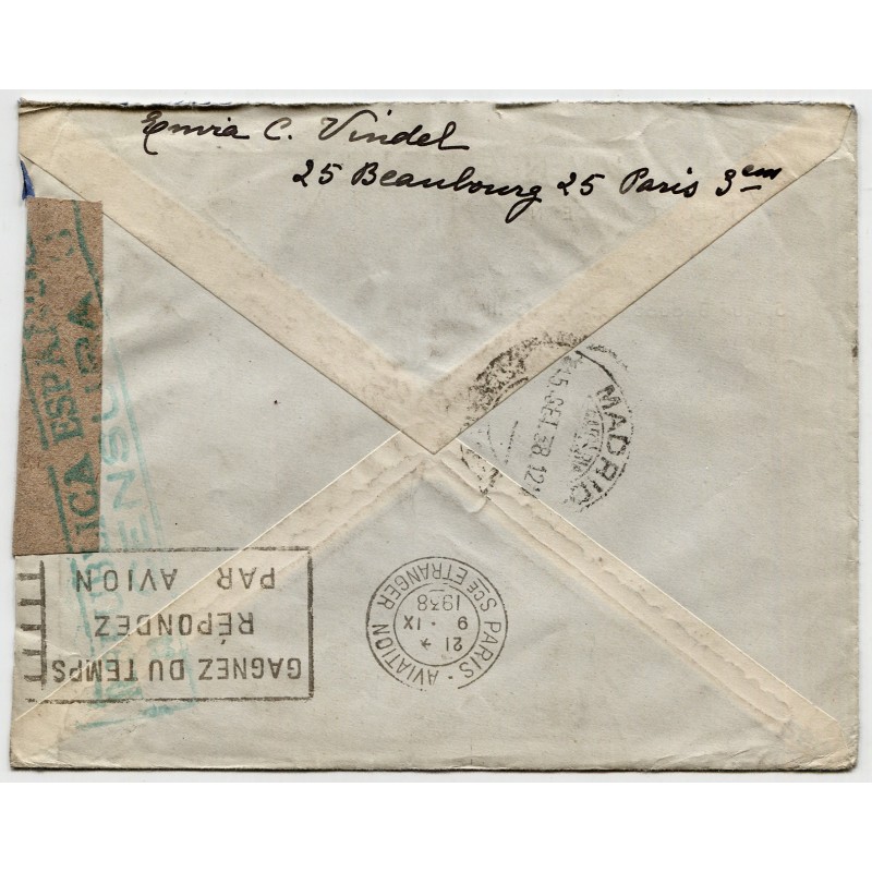 Paris Rue St. Denis postmark of Sept. 9 1938 and green Barcelona censor mark Heller RB3.12a. Arrival and transit backstamps.