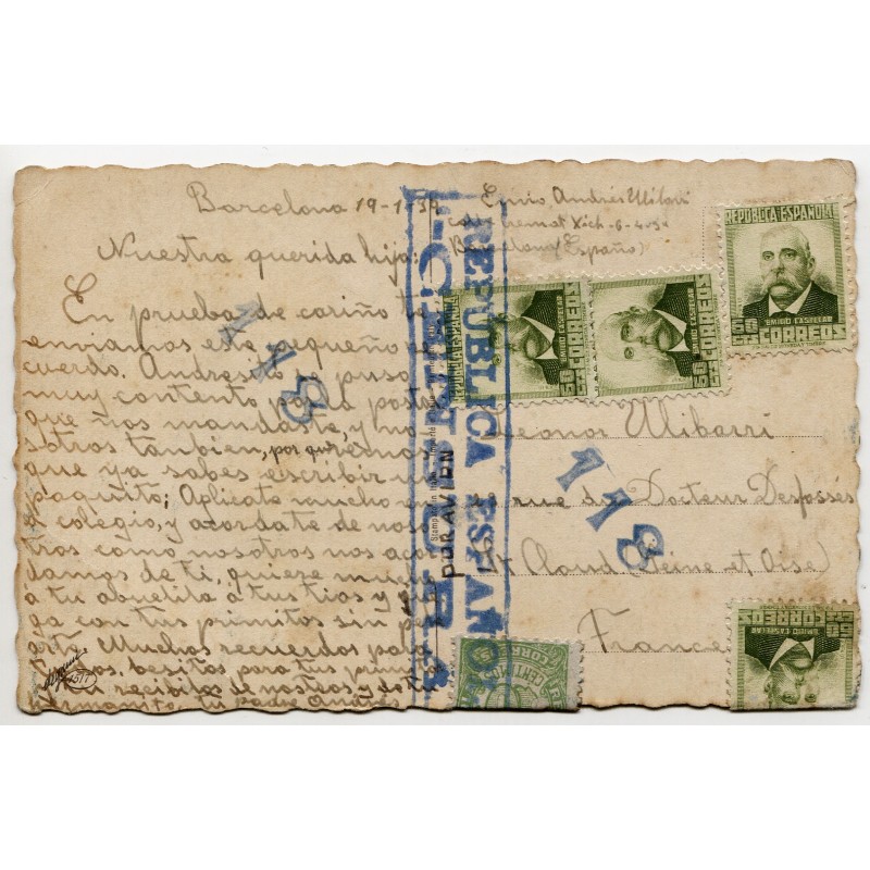 Censor mark Heoller RB3.17. No postmark, but text dated on January 19, 1939, just a week before Barcelona was occupied by Franco's army.