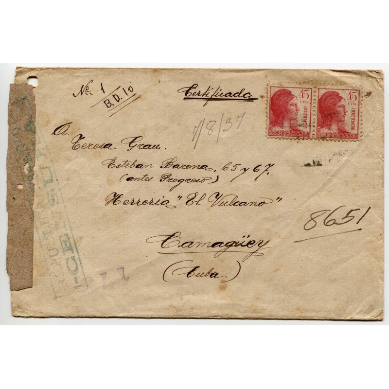 Registered mail cover franked with pair of 45c Edifil 752 to Camagüey, Cuba, with unreadable date in the postmark, sent from Disciplinary Battalion Nr 10. Barcelona censor mark Heller RB3.17 on the front and the back, and also Habana transit mark on the back dated on August 31, 1938 and Camagüey arrival postmark of September 1, 1938.
