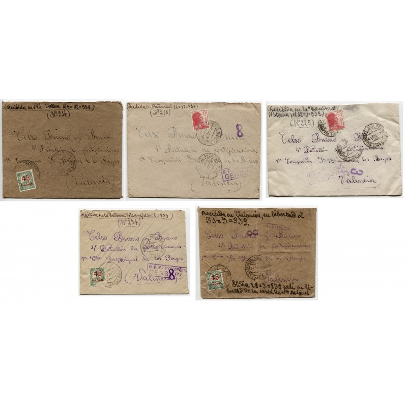 Lot of 5 covers sent between Nov 28, 1938 and Mar 24, 1939 to Celso Bueno y Bueno, in San Miguel de los Reyes prison’s 4º Batallón de Fortificaciones. Three of them with content, from where it is made clear the prisoner was allowed to send two letters per month. Sent by his wife Mercedes Marco, in Villanueva del Arzobispo, Jaén. The addressee wrote on the covers the date and where did he received them, as the 4º Batallón de Fortificaciones was mobile. The first one, as per his notes, was received in Pla Vallesa, the second in Paterna, third and fourth in La Tandera of Paterna and the last one in Valencia, a day after the end of the war, on Mar 31, 1939, when he was liberated. All the covers have the San Miguel de los Reyes prison censor mark, «D.P. Nº1 – VALENCIA / CENSURA» in violet.