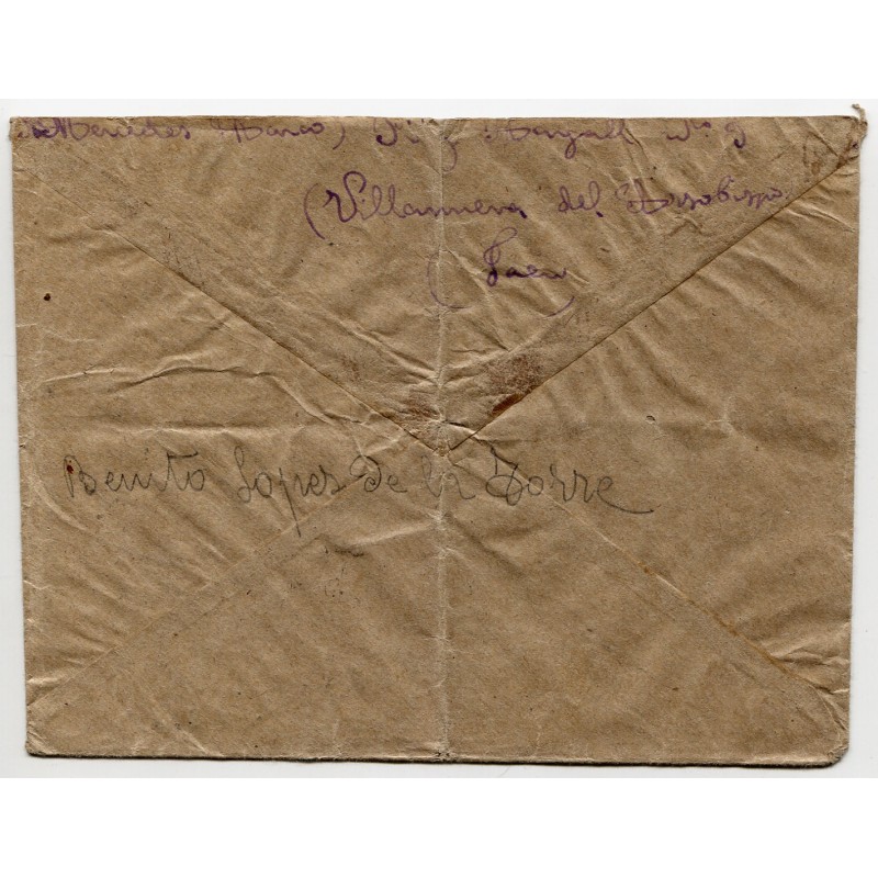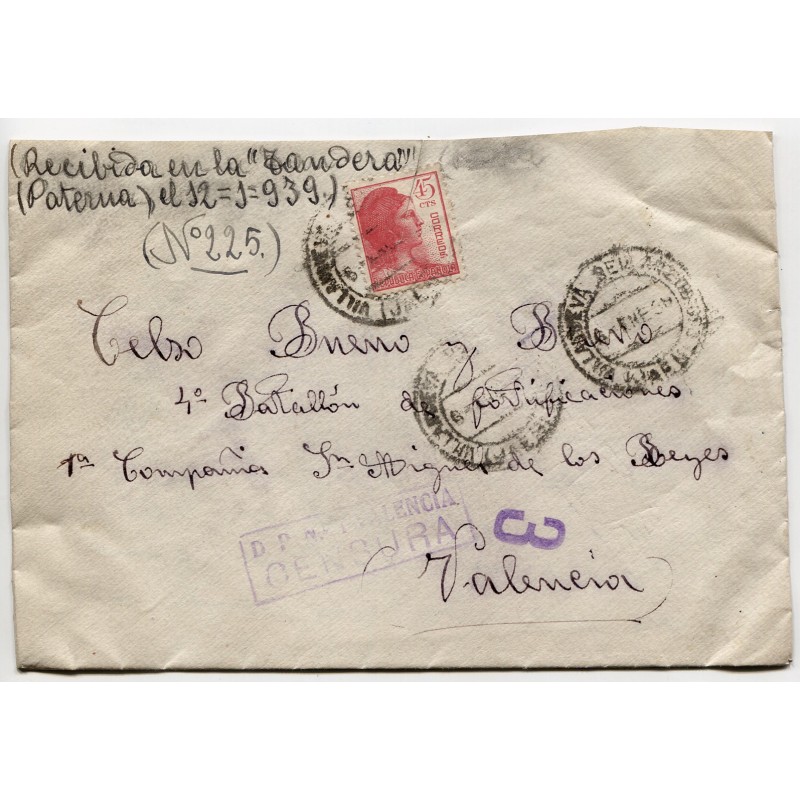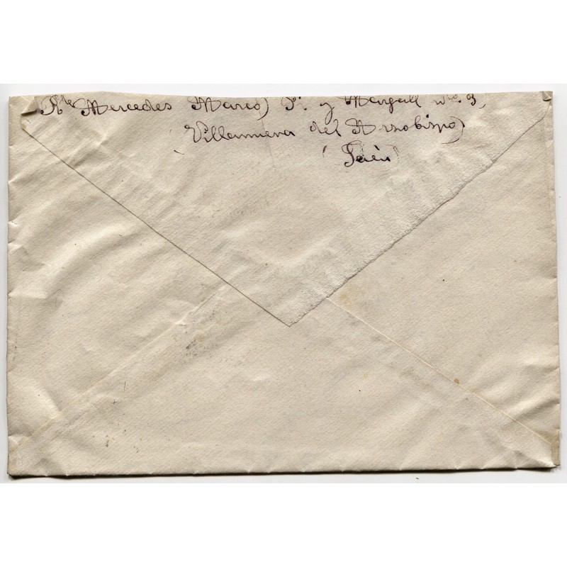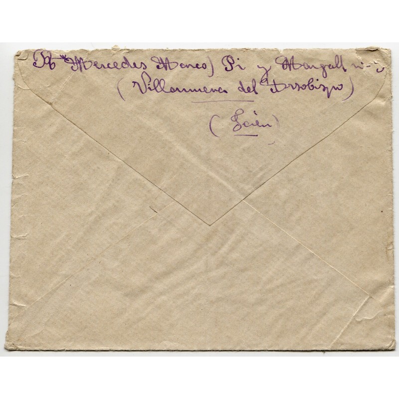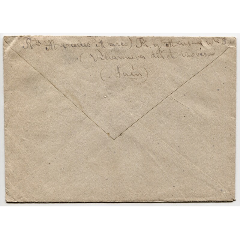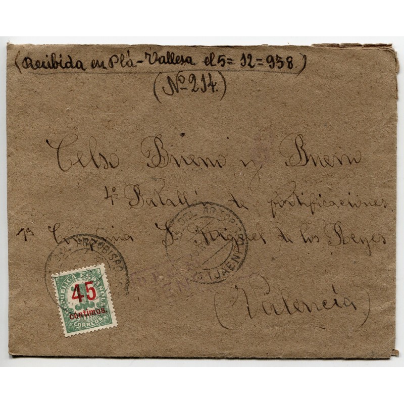 Cover franked with 45c Edifil 742 and Villanueva del Arzobispo postmark dated on Nov 28, 1938. Faded censor mark. Handwritten by the addressee «Received in Plá-Vallesa on December 12, 1938». With content.