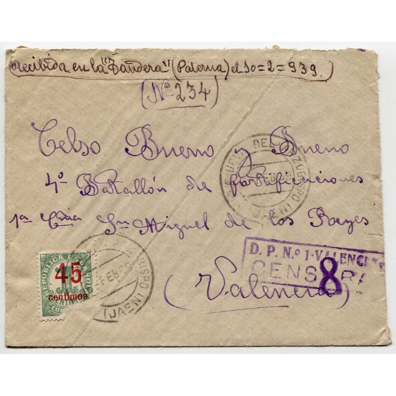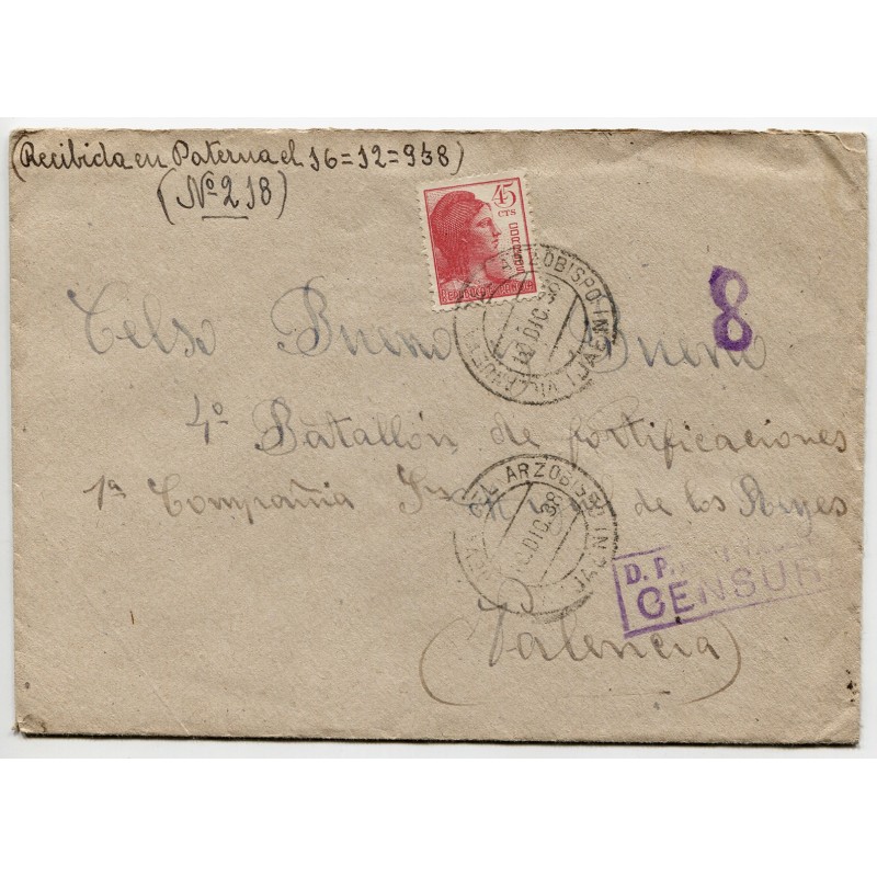 Cover franked with 45c Edifil 752 and Villanueva del Arzobispo postmark dated on Dec 10, 1938. Faded censor mark and number «8». Handwritten by the addressee «Received in Paterna on December 16, 1938». With content.