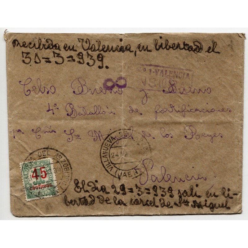 Cover franked with 45c Edifil 742 and Villanueva del Arzobispo postmark dated on Mar 24, 1939. Censor mark and number «8». Handwritten by the addressee «Received in Valencia, liberatad, on March 31, 1939». On the cover’s footer another note: «On March 29, 1939, I was liberated from St. Miguel prison». This is one of the last covers circulated through the Spanish Republic mail.