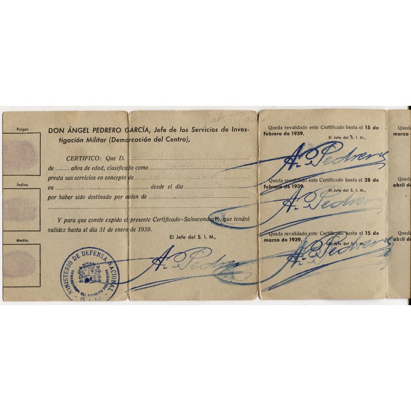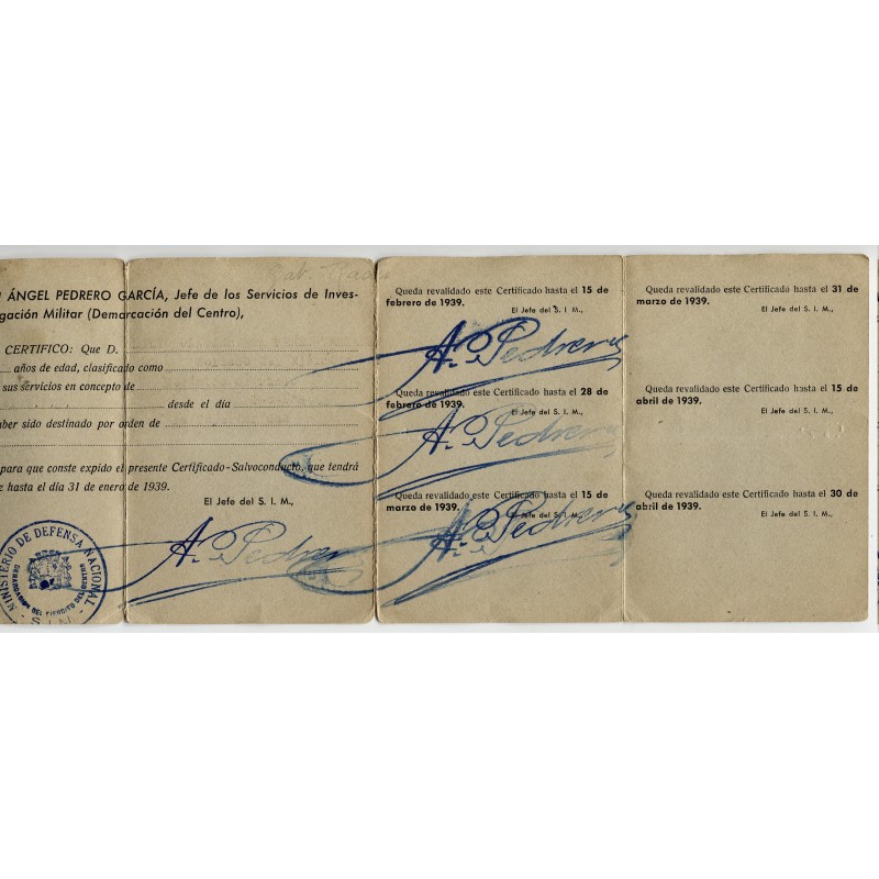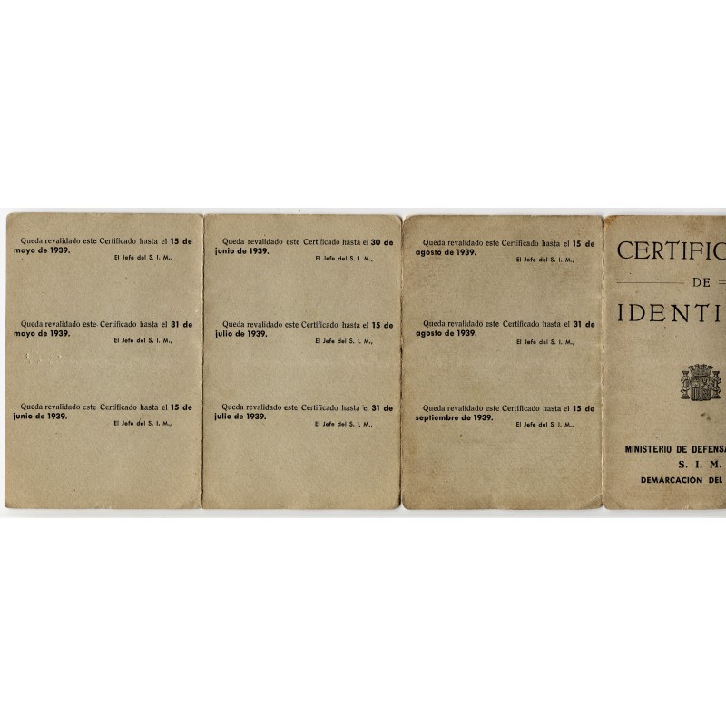 S.I.M. member’s ID card, Demarcación del Centro, authorized by Ángel Pedrero García, valid until January 31, 1939 and renewed until March 15, 1939, with preprinted renewals until September 15, 1939. Typewrited holder’s data, but very faded for the printing low quality.