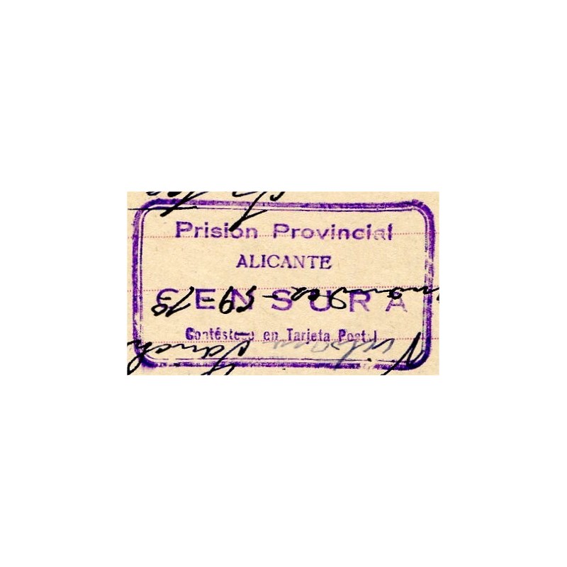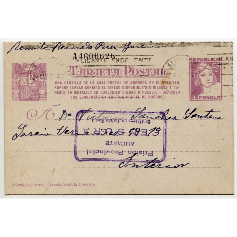 Postal stationery Edifil 78n with roller postmark from Alicante dated on May 29, 1938, with censor mark «Prisión Provincial / ALICANTE / CENSURA / Contéstese en Tarjeta Postal». Sent by Recaredo Pérez García.