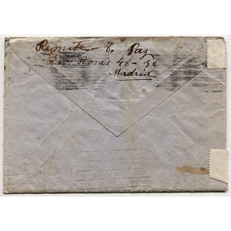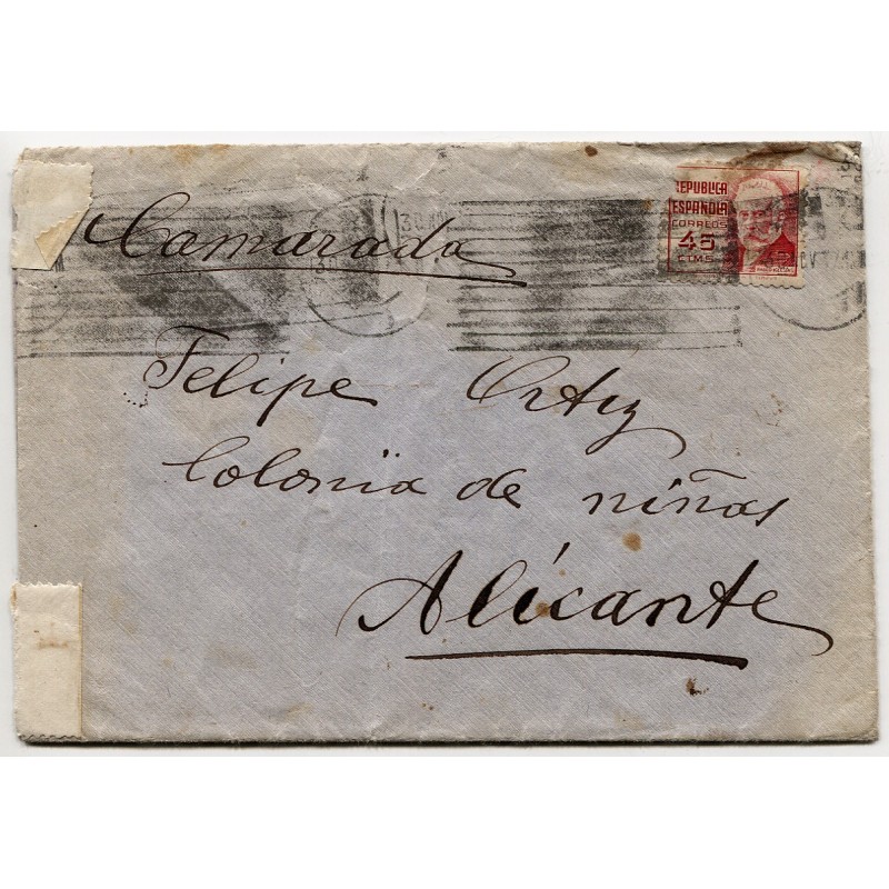 Cover to Colonia de Niños, from Madrid to Alicante. Many children were moved from Madrid and other cities near the front to safer zones in the coast, where they were hosted in special colonies for children. Unreadable postmarks, but content inside dated on November 27, 1937. Very rare.