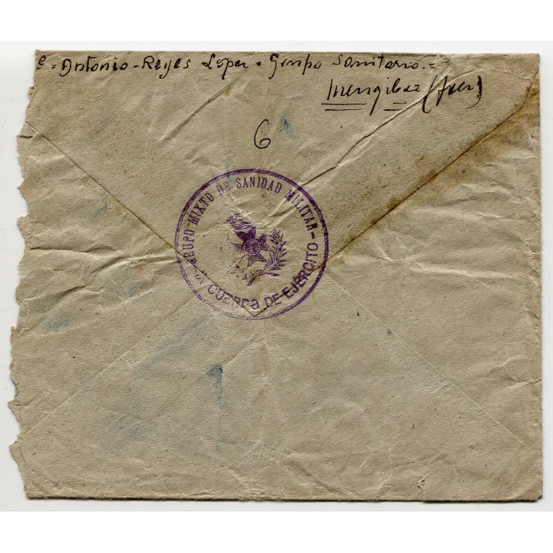 Sent by Antonio Reyes López, Grupo Sanitario, Mengíbar (Jaén), with mark "GRUPO MIXTO DE SANIDAD MILITAR - IX CUERPO DE EJÉRCITO".