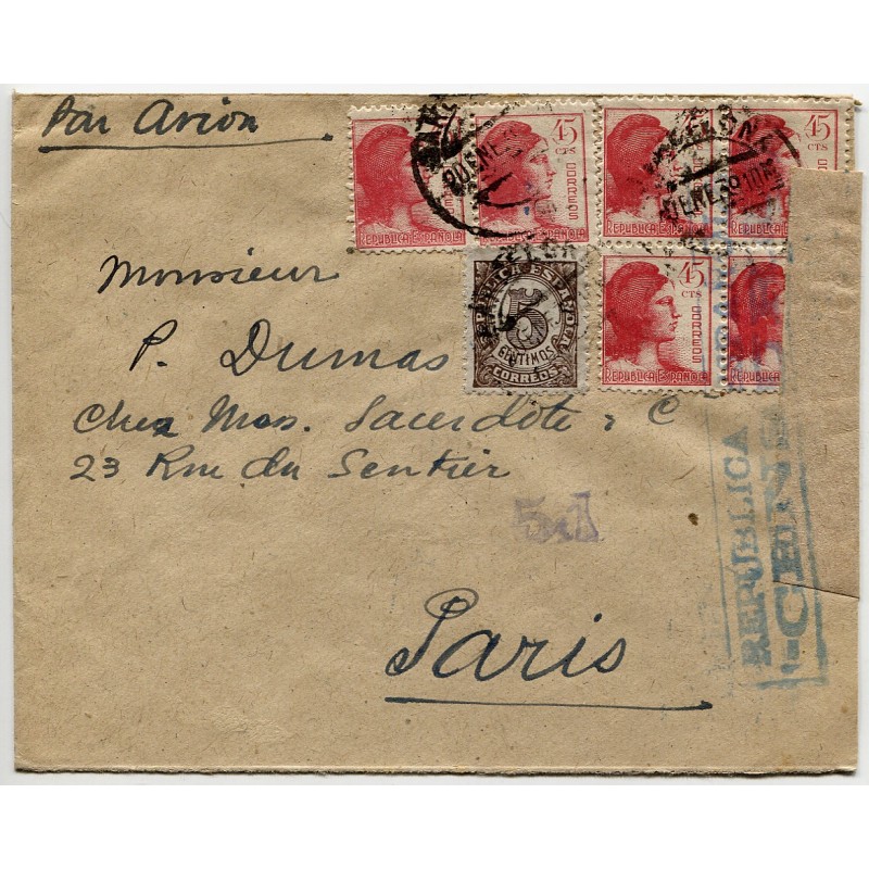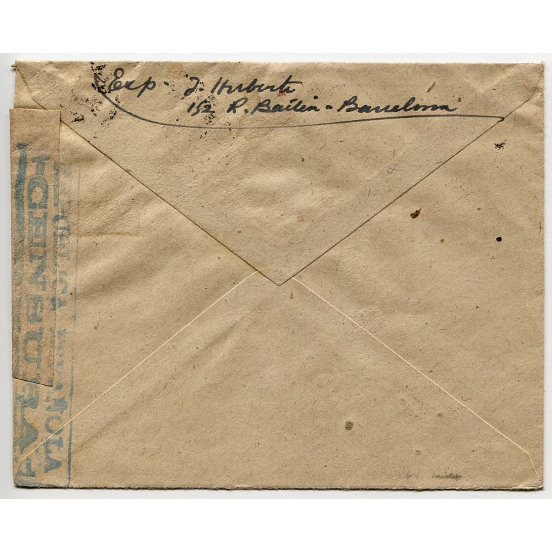 Cover from Barcelona to France with postmark dated on February 20, 1939. The city was occuped by the Francoist army six days later, on February 26, 1939. One of the last pieces of Republican mail shipped from Barcelona. Cenosr mark Heller RB3.17 in green.