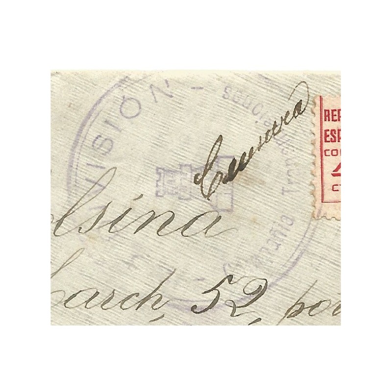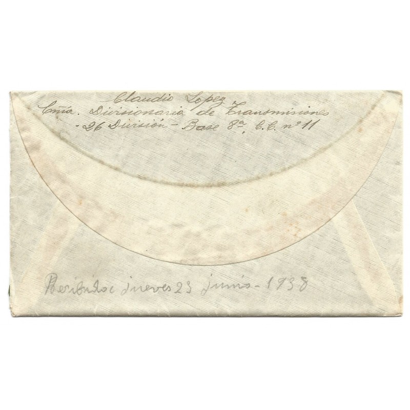 Field post cover from the front to Barcelona franked with Edifil 737, cancelled with mark reading “26 División, Compañía de Transmisiones”, and “Censura” (censor) handriwtten on it. Content dated 20 Jun 1938.