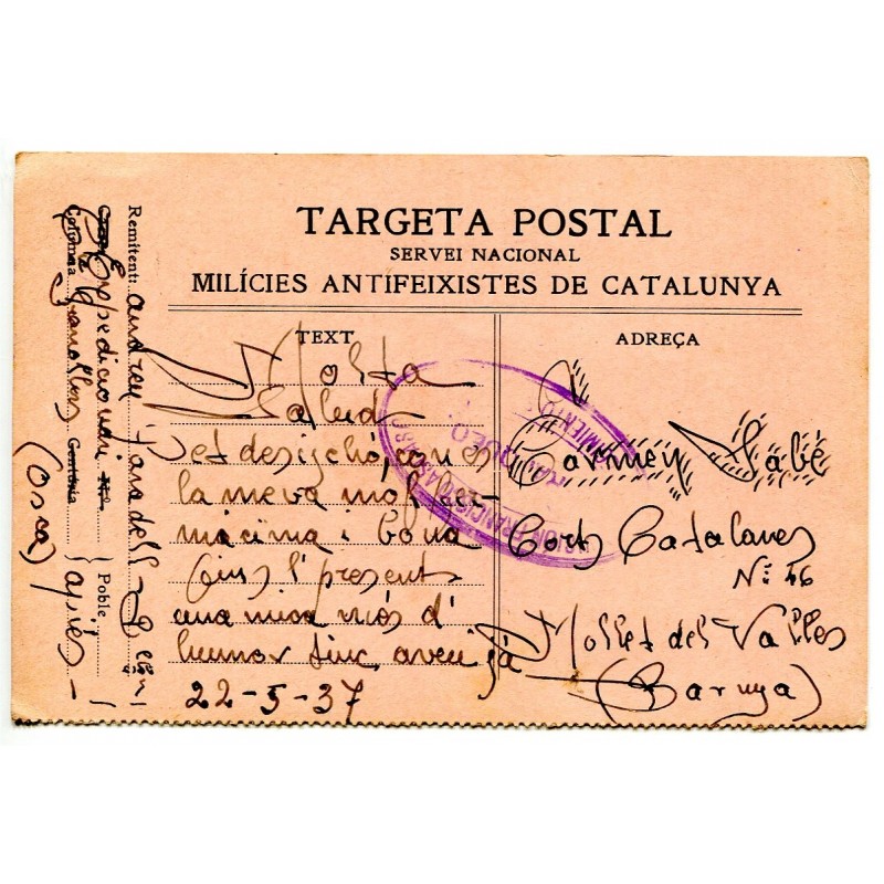 Franchise mark of División Francisco Ascaso, Regimiento Rojo y Negro, on post card of Milícies Antifeixistes de Catalunya from the Aragon front to Mollet del Vallès. Allepuz 1758.