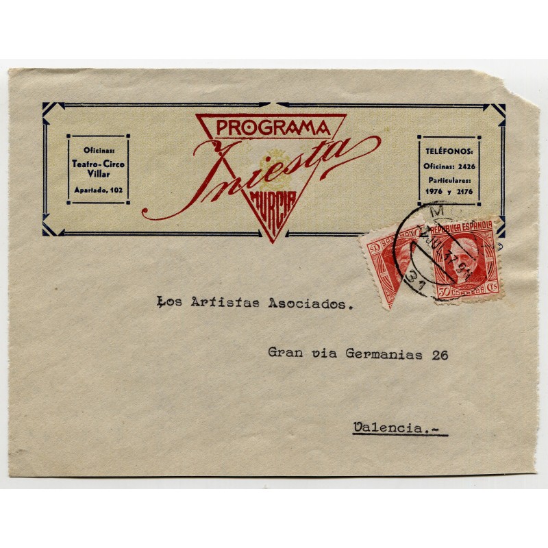 Front cover from Murcia to Valencia with bisected stamp, 1937