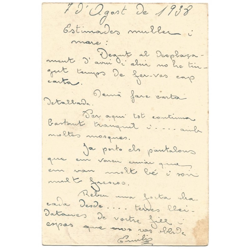 Postal stationery Edifil 79 from the front to Barcelona with field postmark ECC No 12A dated on August 8, 1938. Moisture on bottom right corner.