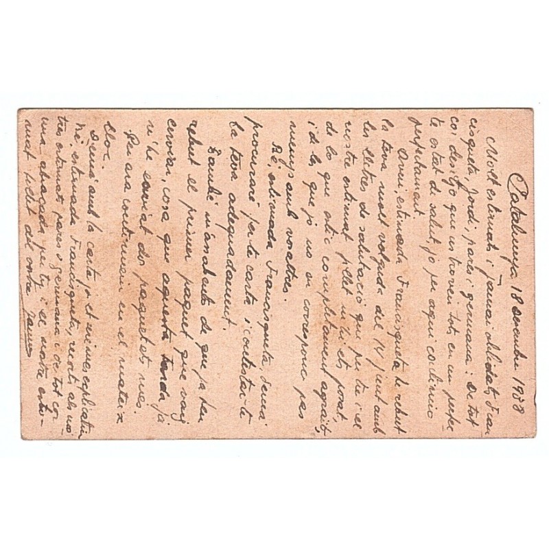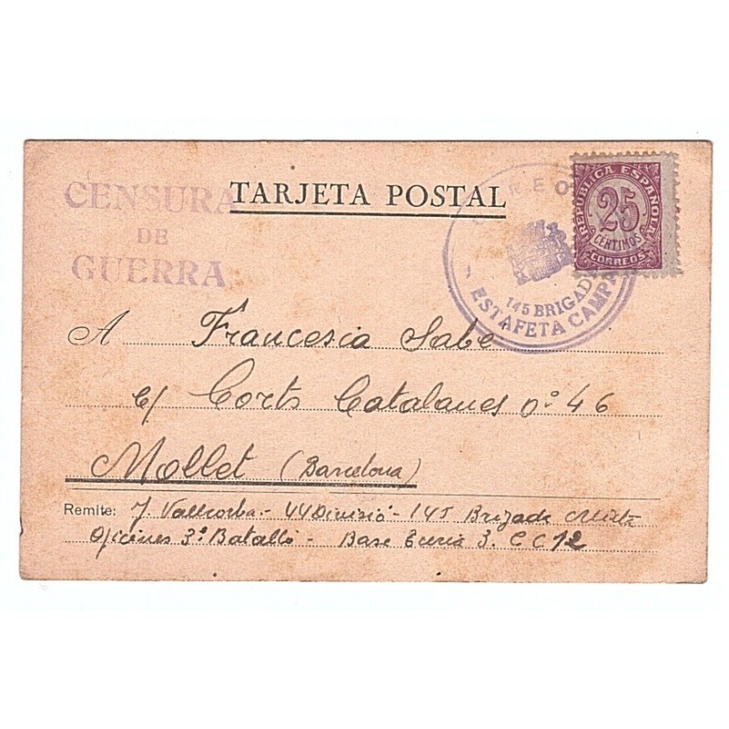 Republican field post card with censor & postmark from the 145 Brigada Mixta in blue, reading “CORREOS / 145 BRIGADA / ESTAFETA DE CAMPAÑA”. Sent by the soldier Jaume Vallcorba to his wife Francesca Sabé in Mollet del Vallès, and dated September 18, 1938. Allepuz 1753.