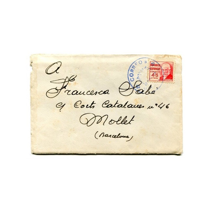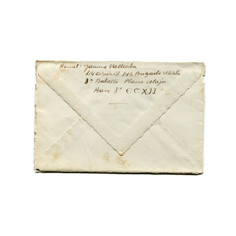 Description: Spain, Civil War, Republican Field Post Cover, 145 Brigada Mixta franchise mark used as postmark. Sent by the soldier Jaume Vallcorba, from 44 Division, 145 Brigada Mixta, 3r Batallon, from the front to his wife Francesca Sabé in Mollet del Vallès (Barcelona). With content. Letter dated on June 3, 1938.