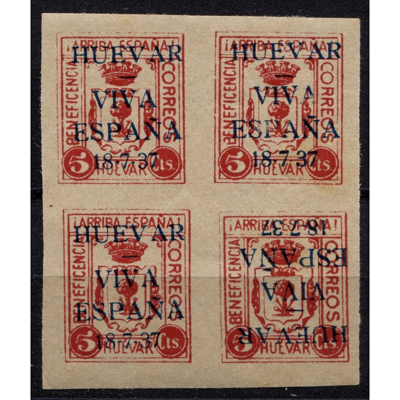 Huévar, block of 4 with overprints, one inverted, Allepuz 126, RR, MNH