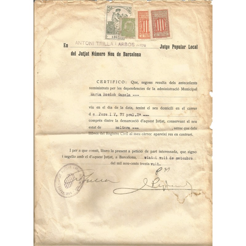Document from Barcelona’s Local People’s Court nr 9 with fiscal stamp 0.25p Alemany 625, 10c & 25c Generalitat fiscal stamps unlisted and postage stamp 10c Edifil 746 used as fiscal. The document is a certificate of residency of a citizen. Dated 28 Sep 1938. Moisture traces and erosion on borders.