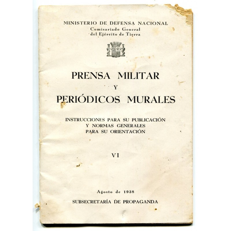 Republican Army booklet Prensa Militar y Periódicos Murales, August 1938, Ministerio de Defensa Nacional, Comisariado General del Ejercito de Tierra, Subsecretaria de Propaganda, 24 pages. Introduction by B. F. Osorio Tafall, General Comissar of the Army. Instructions for the military press and "wall newspapers".