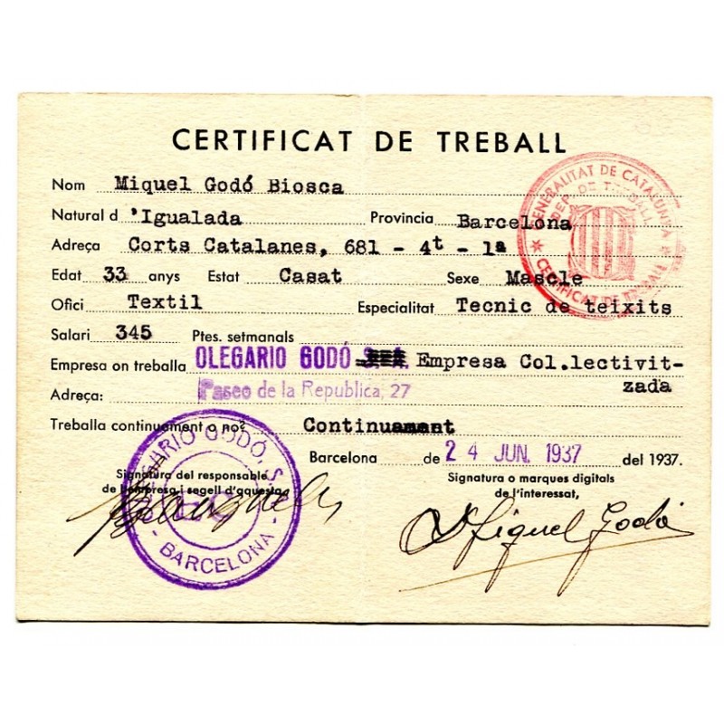 Working Certificate of the collectivised company Olegario Godó SA, Barcelona, 1937