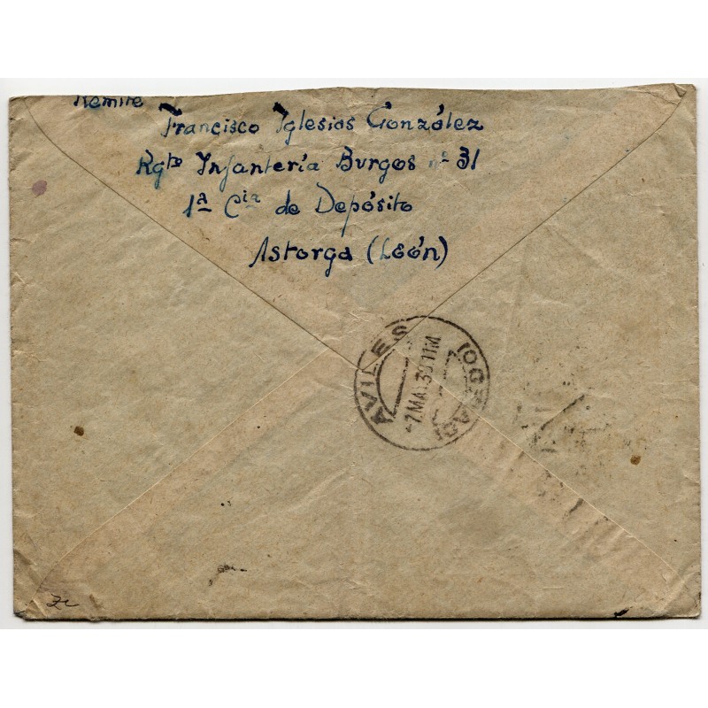 Astorga censor mark Heller A138.2 and postmark dated on May 4, 1938. Avilés arrival backstamp.