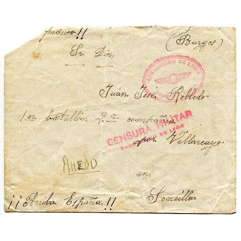 Cover from Leon military air field to Ahedo, with very rare franchise mark «Aerodromo de Leon, Franquicia Postal» and military censor mark «Censura Militar, Aerodromo de Leon».