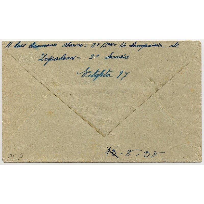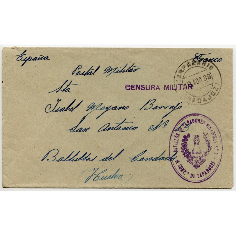 Franchise mark "BATALLÓN DE ZAPADORES MINADORES Nº 2 - 14 COMPª DE ZAPADORES", censor and Campanario postmark dated on August 10, 1938.
