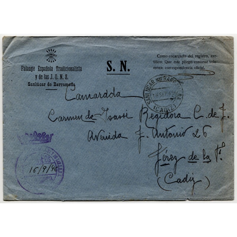 Falange franchise mark and Sanlúcar de Barrameda postmark dated on September 16, 1946. Curious content.
