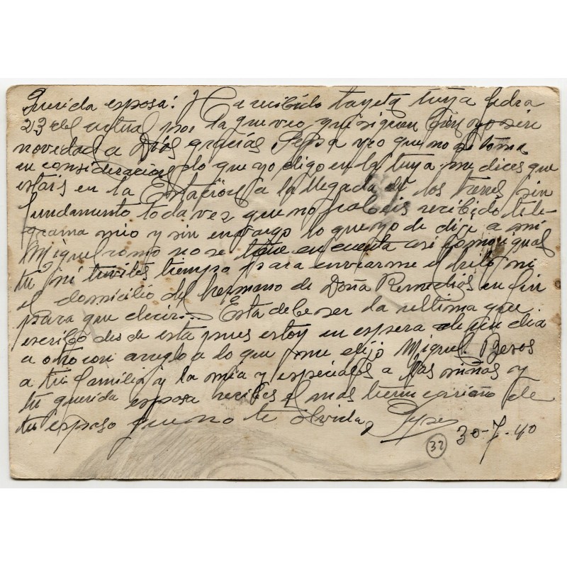 Sent by the prisoner José Díaz Gutiérrez, Departamento 2, Planta Alta, Santoña (Santander). Colonia Penitanciaria del Dueso censor mark, and Santoña postmark dated on August 1, 1940.
