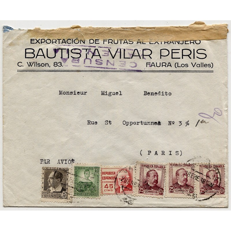 Cover from Faura to France with Valencia censor mark Heller RV2.4, 1938