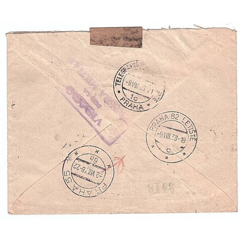 International Brigades air mail and registered cover from Alicante to Czechoslovaquia. On the front there is not any special mark belonging to the International Brigades, and even the postmark is the regular mark from Alicante, dated July 28, 1938. One stamp missing. But on the back there is their special censor mark in violet, reading "VISADO / POR LA / CENSURA MILITAR" Heller Brig. 5a. Also three different Praha arrival postmarks, all dated August 9, 1938.