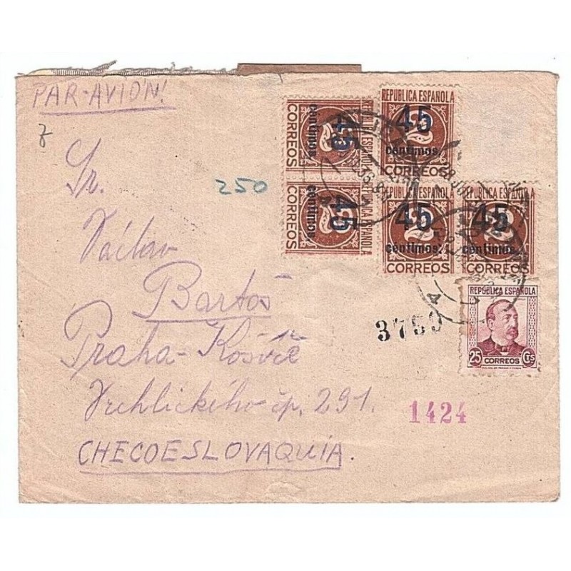 International Brigades air mail and registered cover from Alicante to Czechoslovaquia. On the front there is not any special mark belonging to the International Brigades, and even the postmark is the regular mark from Alicante, dated July 28, 1938.