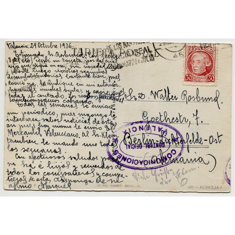 Valencia postmark dated on October 29, 1936 and censor mark Heller RV2.1b.