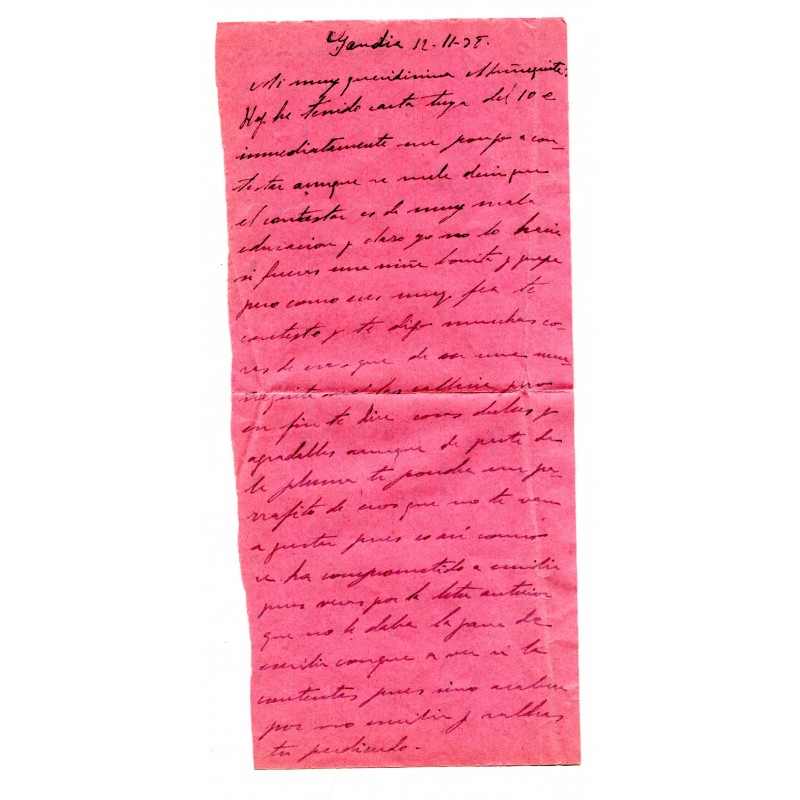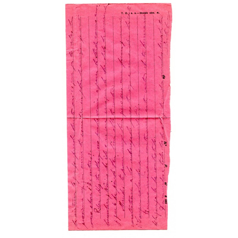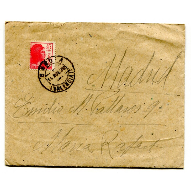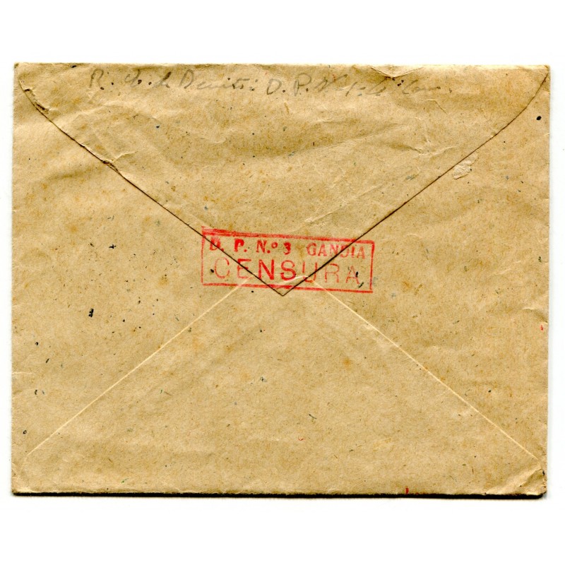 Cover from Los Escolapios prison to Madrid, franked with 45c Edifil 752 and Gandia postmark of November 14, 1938. Very clean censor mark "D.P. Nº 3 GANDIA / CENSURA" on the back, plus sender's info: "E. de Benito, D.P. Nº 1, 4a Compañía". Sent by the prisoner Esteban de Benito to his wife Maria Rafart. With content: letter sent by the prisoner and previous answer from his wife.