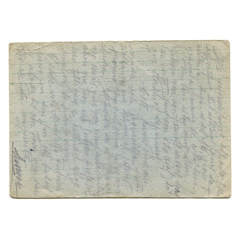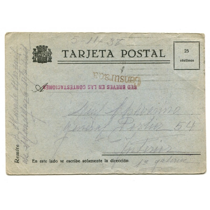 Sent to Luis Cavarino by his wife Aurora Murado. The prison in Madrid’s General Porlier street was officialy named «Prisión Provisional de Hombres Nº 3». The post card bears two marks: «Censurada» in black ink and «Sed breves en las contestaciones» in red, both stamped upon arrival to General Porlier’s prison. Stamp lacking, but text dated on Nov 5, 1938.